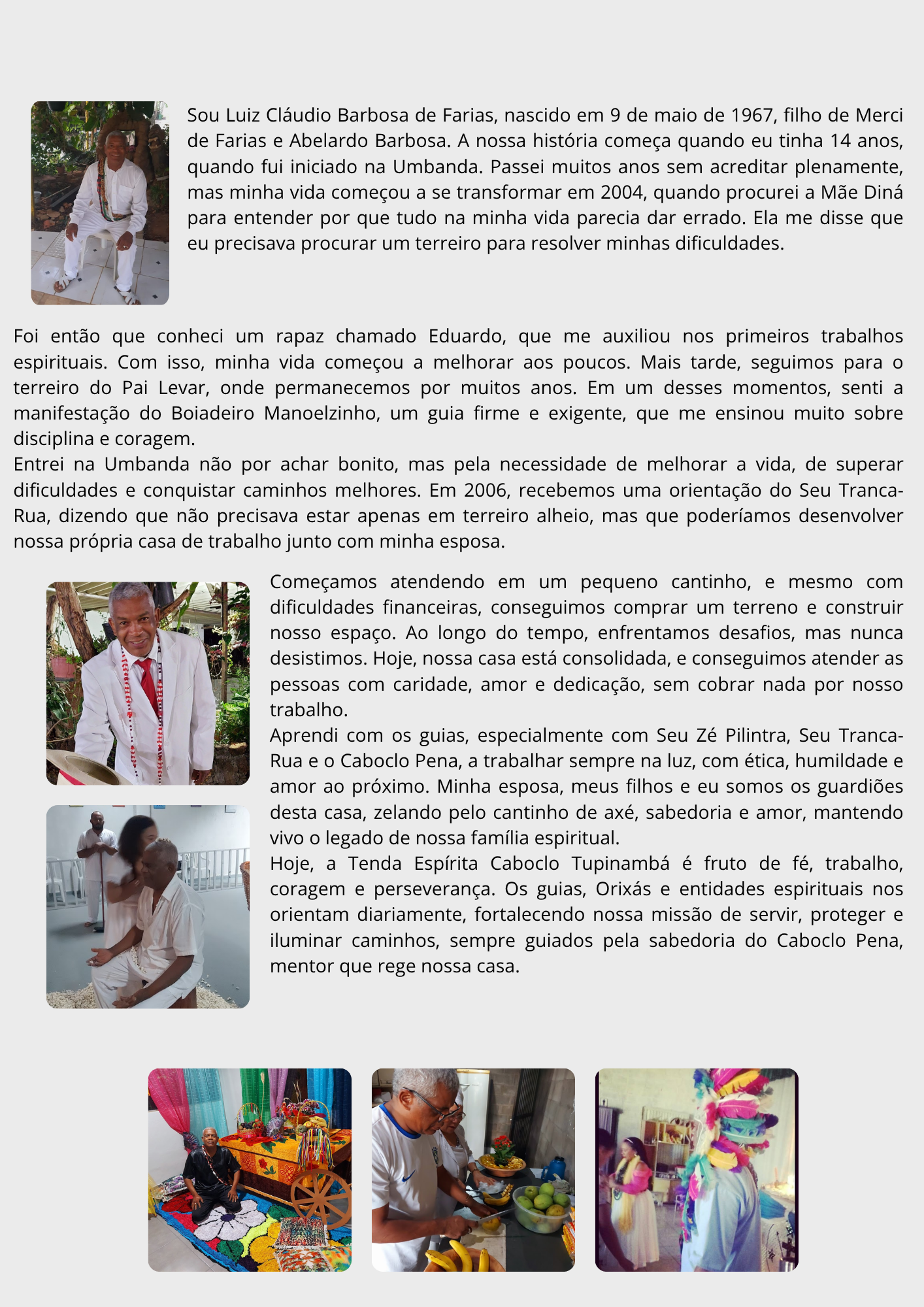 Sua jornada espiritual ganha força dentro da Tenda Espírita Caboclo Tupinambá, espaço sagrado onde Mãe Mazé dedica sua vida a servir, curar, orientar e preservar a ancestralidade do seu povo. Cada conta utilizada em seu peito, cada tecido, cada gesto e cada palavra carrega a memória dos mais velhos e o compromisso com os que ainda virão.